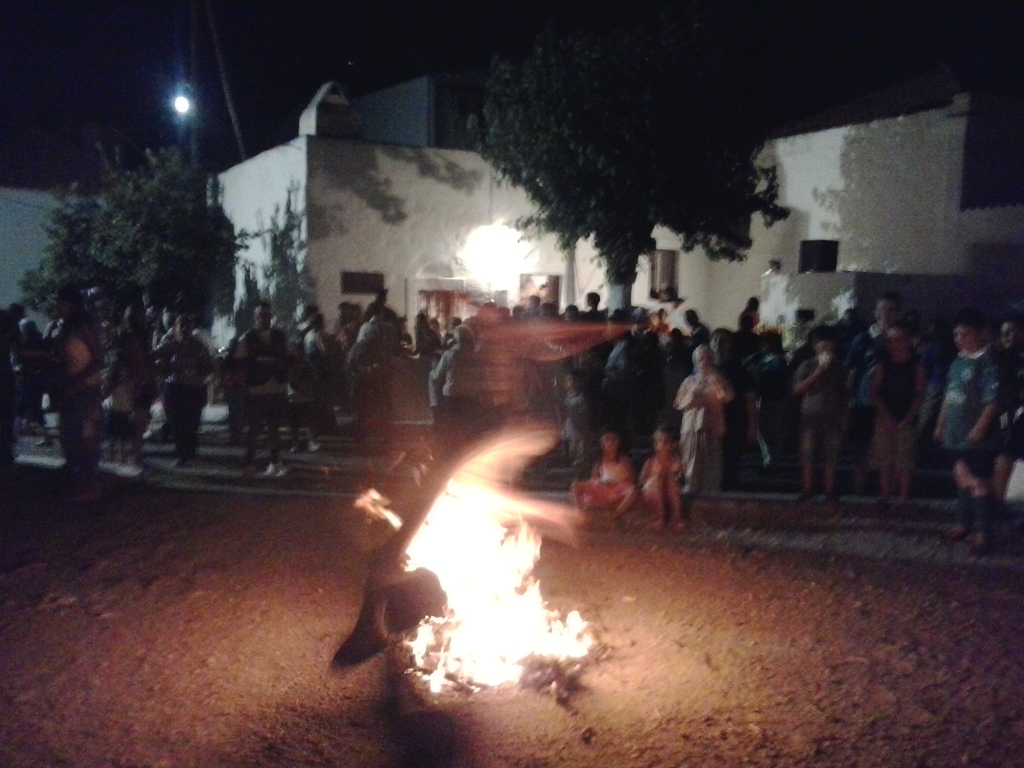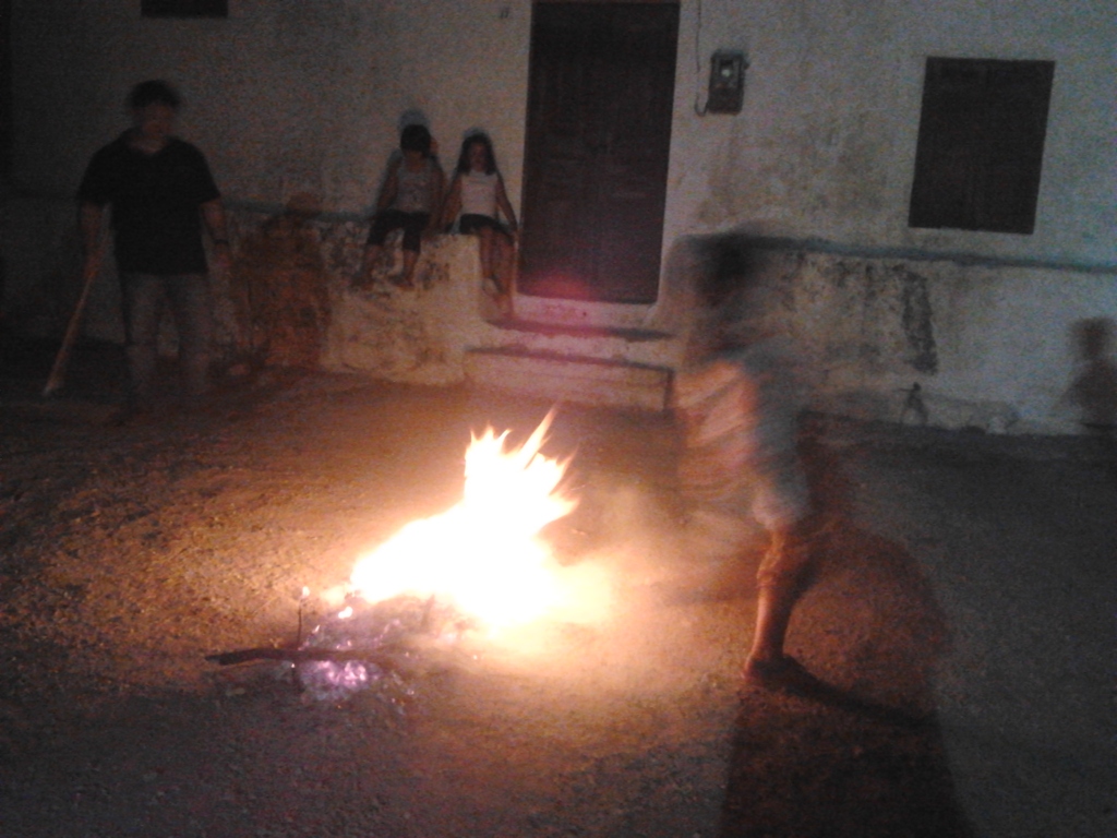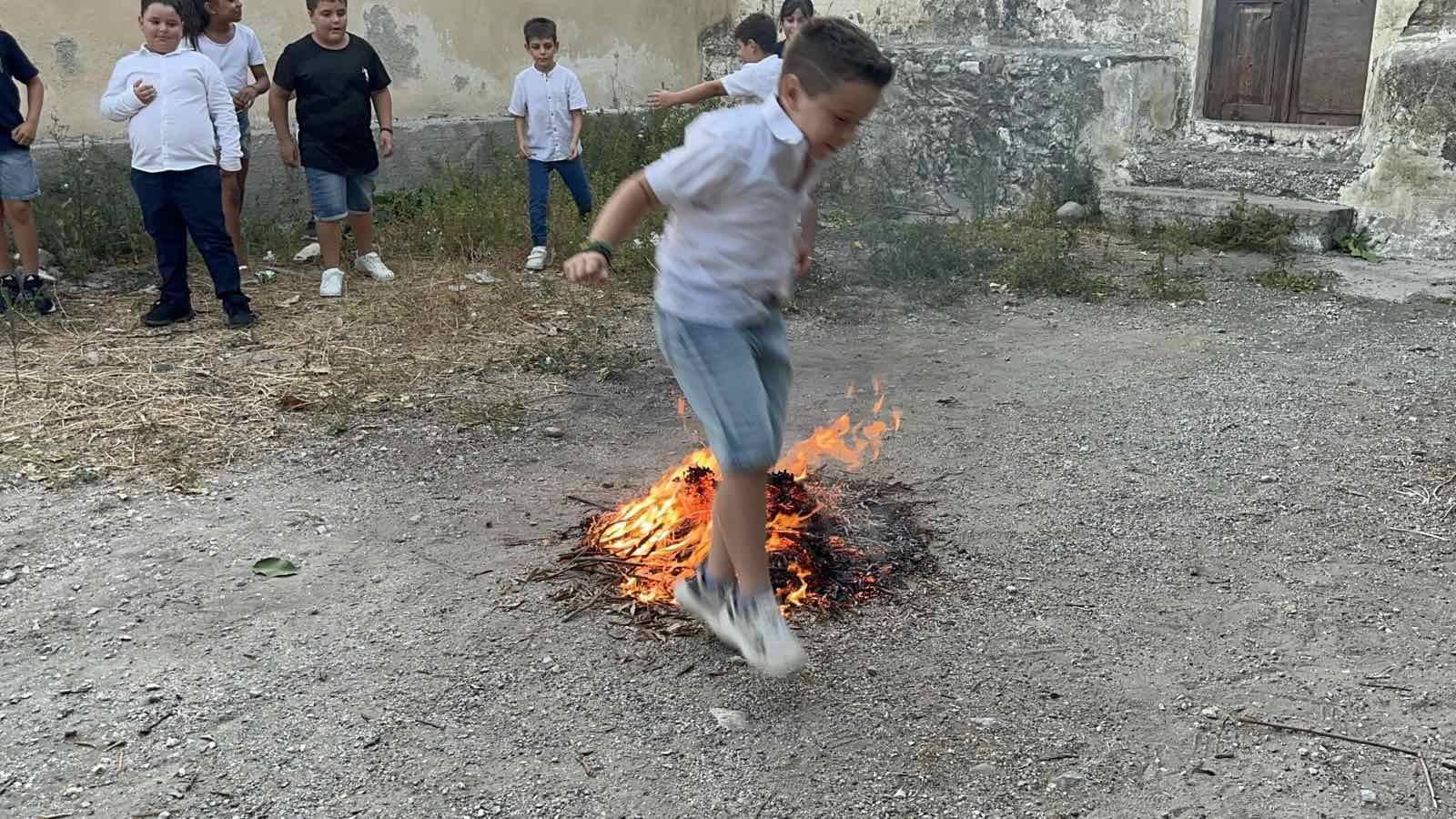 Τα μαγιάτικα στεφάνια καίγονται και οι νέοι, οι νέες, πηδούν πάνω από τη φωτιά.